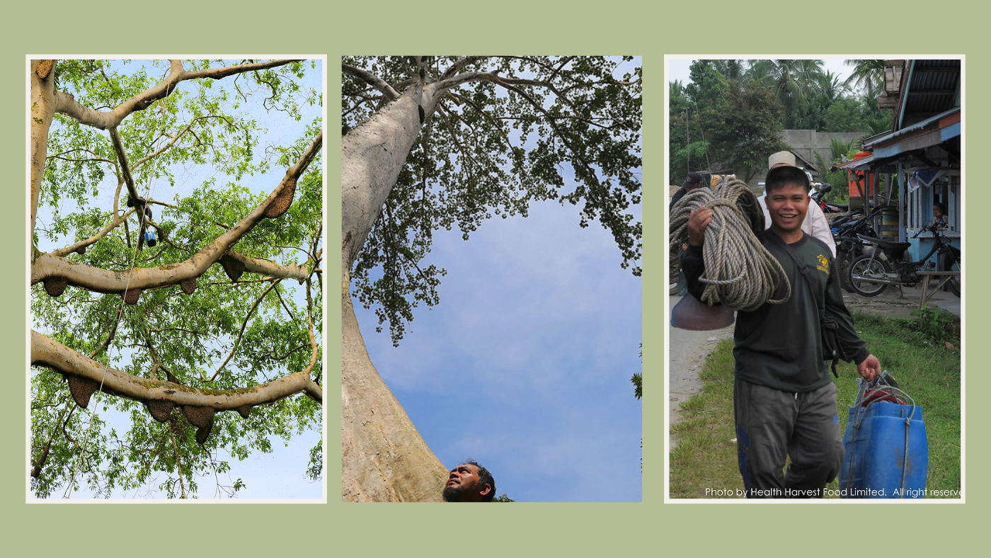 Harvesting is performed using traditional climbing techniques. Climbers ascend the towering Tualang trees using ropes and wooden or metal spikes that are driven into the trunk to create footholds. Most harvesting occurs at night when bees are calmer.